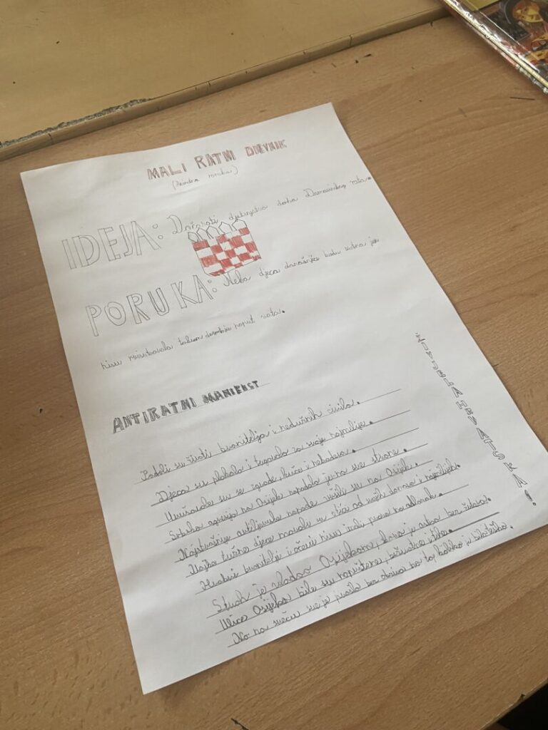 Učenici šestih razreda pod vodstvom učiteljice hrvatskoga jezika Elvire Vujčić, pokazali su kako književnost može biti snažan poticaj za promišljanje o miru i ljudskim vrijednostima. U sklopu obrade djela za cjelovito čitanje – Stjepan Tomaš, Mali ratni dnevnik – proveli su višednevnu aktivnost koja je uključivala samostalni rad kod kuće i grupni rad u učionici.