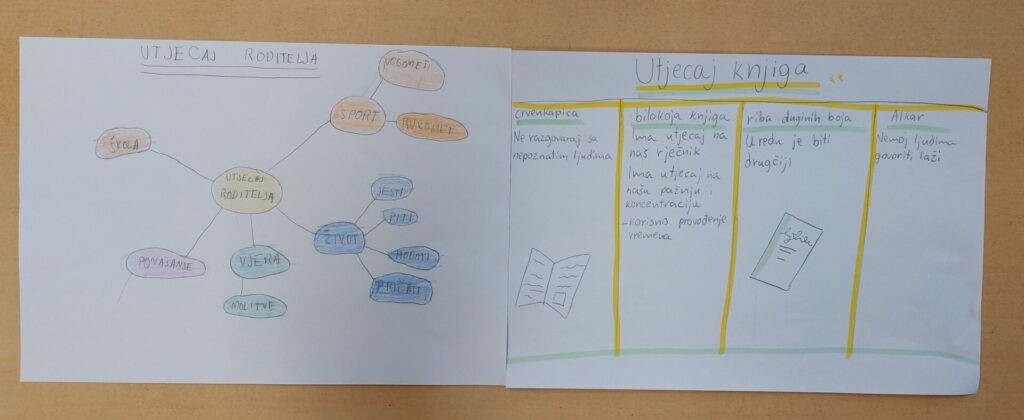 Na početku radionice učenici su razgovarali o tome kako različiti čimbenici iz njihove okoline – obitelj, knjige, prijatelji i škola – utječu na njihov osobni razvoj. Poseban naglasak stavljen je na utjecaj knjiga i roditelja, koji često imaju važnu ulogu u formiranju stavova i životnih vrijednosti.