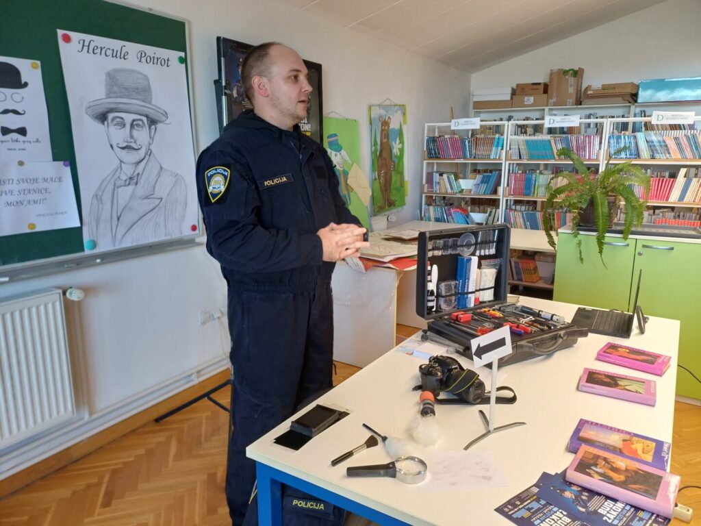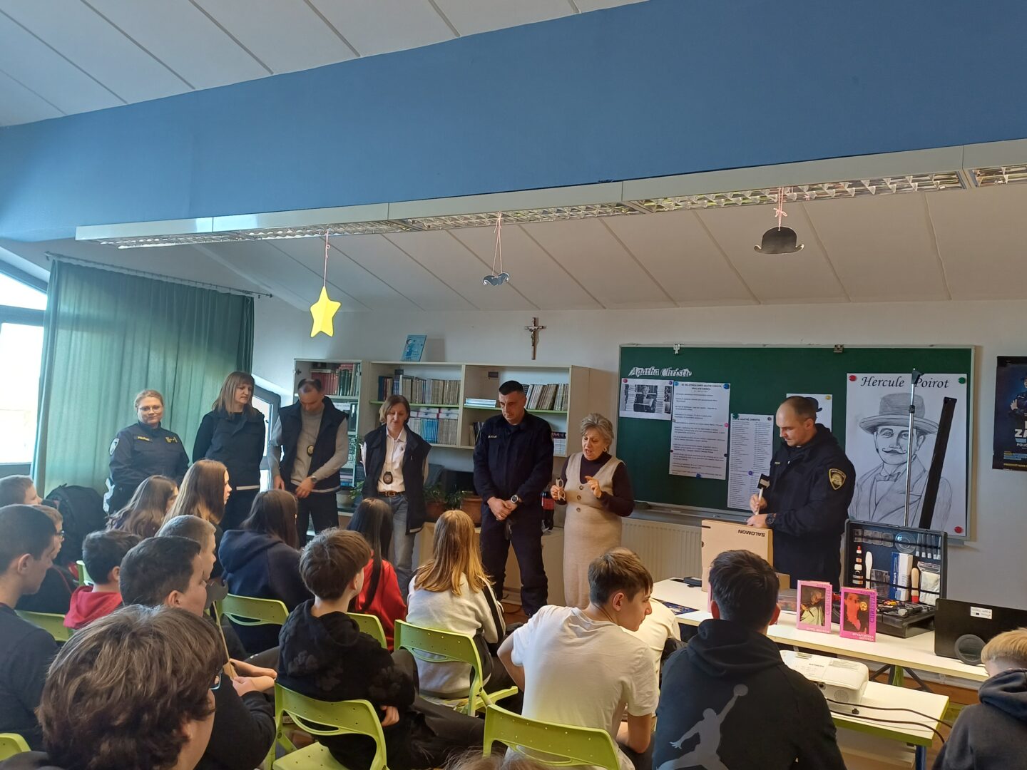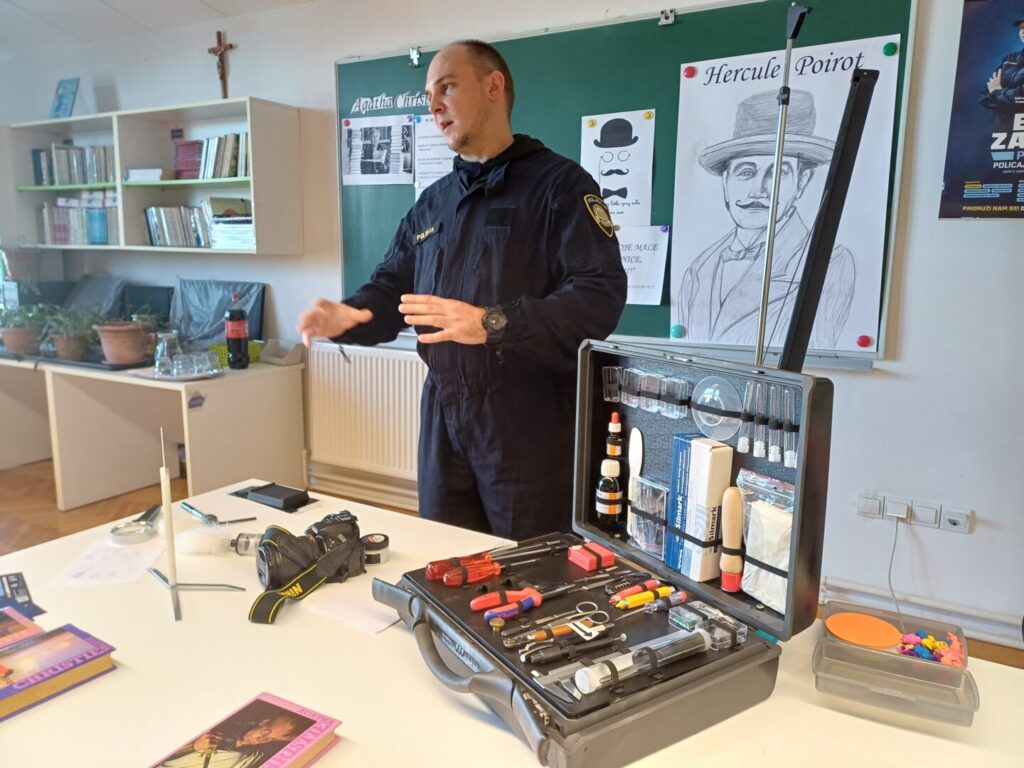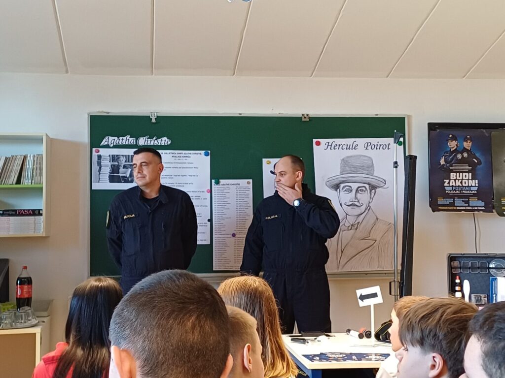 Agatha Christie preminula je 12. siječnja 1976. godine te smo tom prigodom pozvali u našu školu tim kriminalističke policije Virovitičko-podravske županije kako bi našim učenicima približili posao krim-policajca kao i posao detektiva, tj. inspektora koji rade na krvnim deliktima.