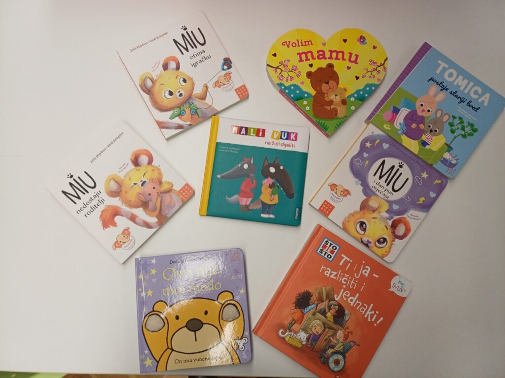 Nabavljeni su ovi naslovi knjiga: Zmajevi koji ne lete, Dom iza žice, Stidljivi Teo, Tata je uvijek tu, Gitina briga, Ovo nije moj medo,  Tomica postaje stariji brat, Miu nedostaju roditelji, Miu i dan pun osjećaja, Vuk koji je želio biti sretan,  Što je što? Ti i ja – različiti i jednaki!, Ti si važan, Pinki!, Volim mamu!, Mali vuk ne želi dijeliti,  Miu otima igračku.