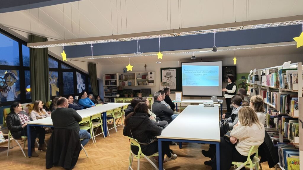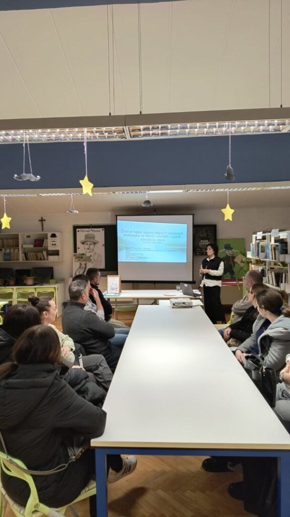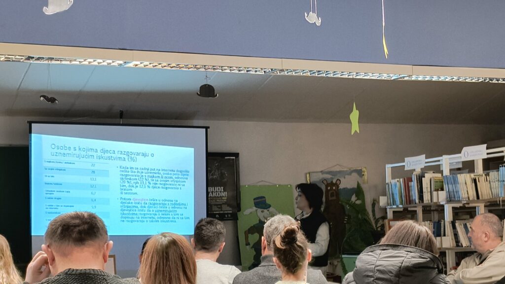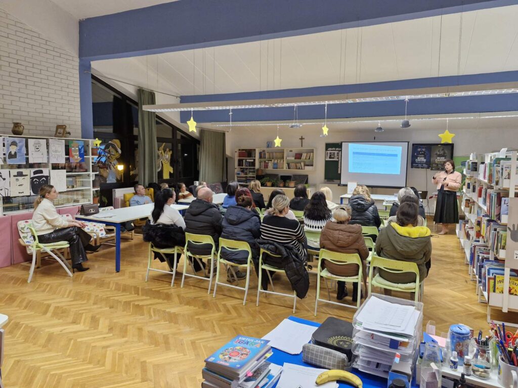 U sklopu preventivnog projekta „Život je bajka- utjecaj odgojnih postupaka roditelja na razvoj ovisničkih i rizičnih ponašanja djece“ održani su roditeljski sastanci u 3.c razreda (učiteljica Renata Grahovac), 3.b razreda (učiteljica Spomenka Bošnjak), 5.a razreda (nastavnica Ivana Strupar), 7.b razreda (nastavnica Iva Vilček) i 5.b razreda (nastavnica Rajka Avirović Gaća) na kojima je knjižničarka i voditeljica projekta Melita Schmitz predstavila nacionalne rezultate međunarodnog istraživanja EU Kids Online 2025.