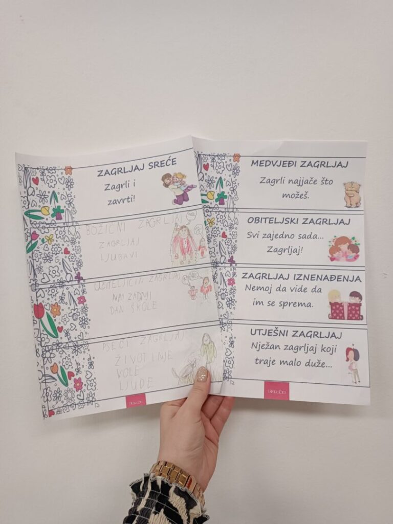 Odlučili smo tijekom cijelog dana jedni drugima pokazati na koje sve načine možemo koristiti zagrljaje i uljepšati dan jedni drugima. Dan smo započeli velikim grupnim zagrljajem, a zatim i razrednim zagrljajem uz učiteljice. Svaka zahvala ili pohvala učenicima bila je iskazana kroz zagrljaj.