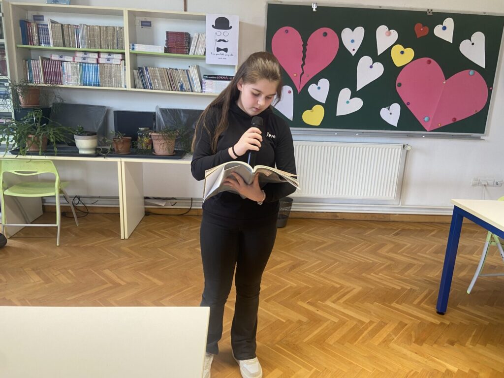 Nastavnica hrvatskoga jezika Elvira Vujčić i knjižničarka Melita Schmitz s učenicima iz nekoliko razrednih odjela priredile su sat čitanja ljubavne poezije.